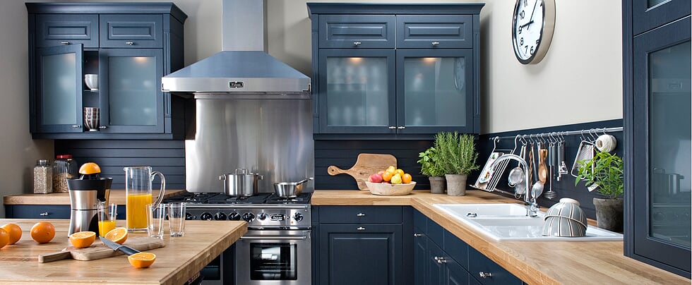 La couleur bleue représente une solution efficace pour donner l'impression d'une cuisine plus spacieuse.